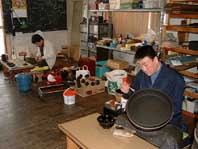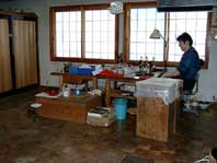 ここは最後の塗り 「上塗り」をするところです。 ここでの塗りで完成になるので 漆にほこりが入らぬように 毎日念入りに掃除しなければ いけません。昔の職人さんは ほこりを嫌うあまり 裸で塗っていたそうです。 |