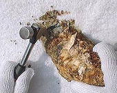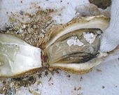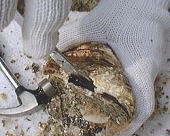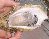 濡れタオルをひき、その上に岩牡蠣を置き、蝶番のほうを抑えて、反対側(広がっているほう)の縁をかなづちで叩いて欠けさせます。 ※場所はコンクリートの所が良いと思います。 ※濡れタオルを引いておくと安定しますし、タオルの上に殻が飛び散るので、後始末が楽です。 |
