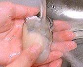 大根おろしか食塩で身をよくもんだ後、水道の流水でよく洗います。 |