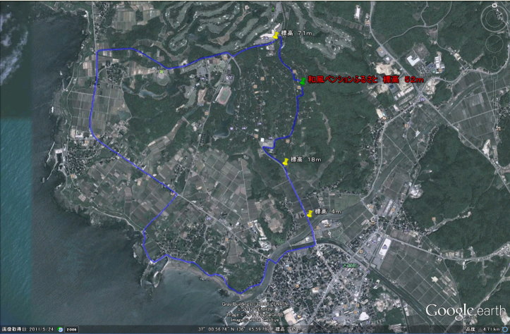 | 衛星写真です。 見て分かるようにペンションの周りは丘陵地帯です。 しかし、以下の理由で ランニング天国 であると思っています。 ご旅行の際には是非ランニング シューズ持参 でお越しください。 @ 自然が豊富 ペンション周辺は山の雰囲気、そして川もあり、何より海を見ながら走るのは最高です。 A 信号機が無い 近辺で信号機があるのは、街中と国道沿いです。 あえてそのような場所は走らないでしょうから、ほぼ信号機フリーです。 B 車、人の数が少ない 早朝に10km走ったら、車2〜3台、人1〜2人しか出会わないこともよくあります。 C 丘陵地帯はアップダウン、 丘陵地帯下からは平坦なコースを選べる 8コース掲載していますが、他にもまだあります。 志賀町陸上競技場へも1.5kmと とても近いです。 |